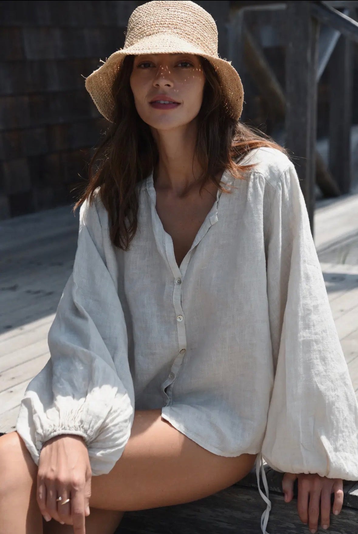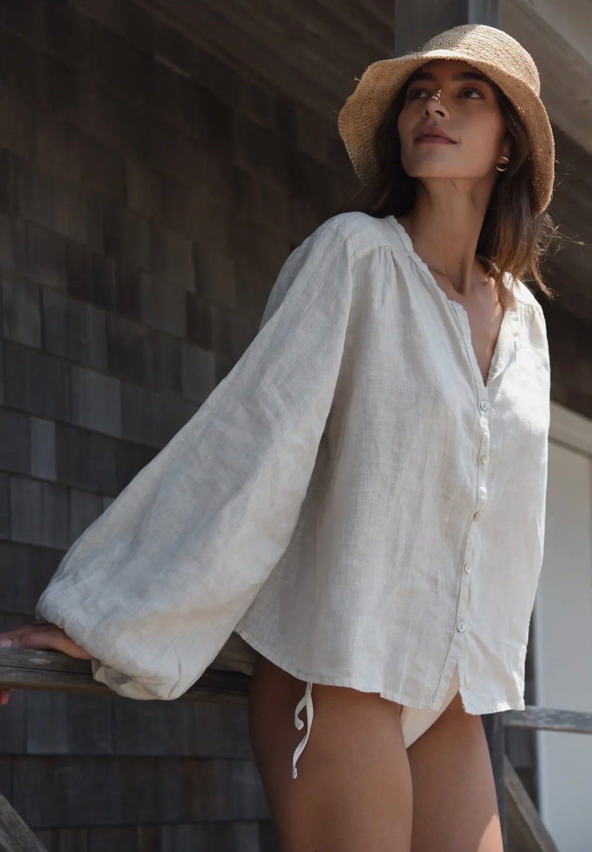 Your new go-to linen top, the Lily Blouse, a whimsical silhouette featuring shell buttons, with flutter sleeves and a slightly oversized fit to add the perfect shape to any look. A relaxed shirt look with a band collar and split neckline for a loose and easy going look, perfectly paired with a pair of jeans or linen pants