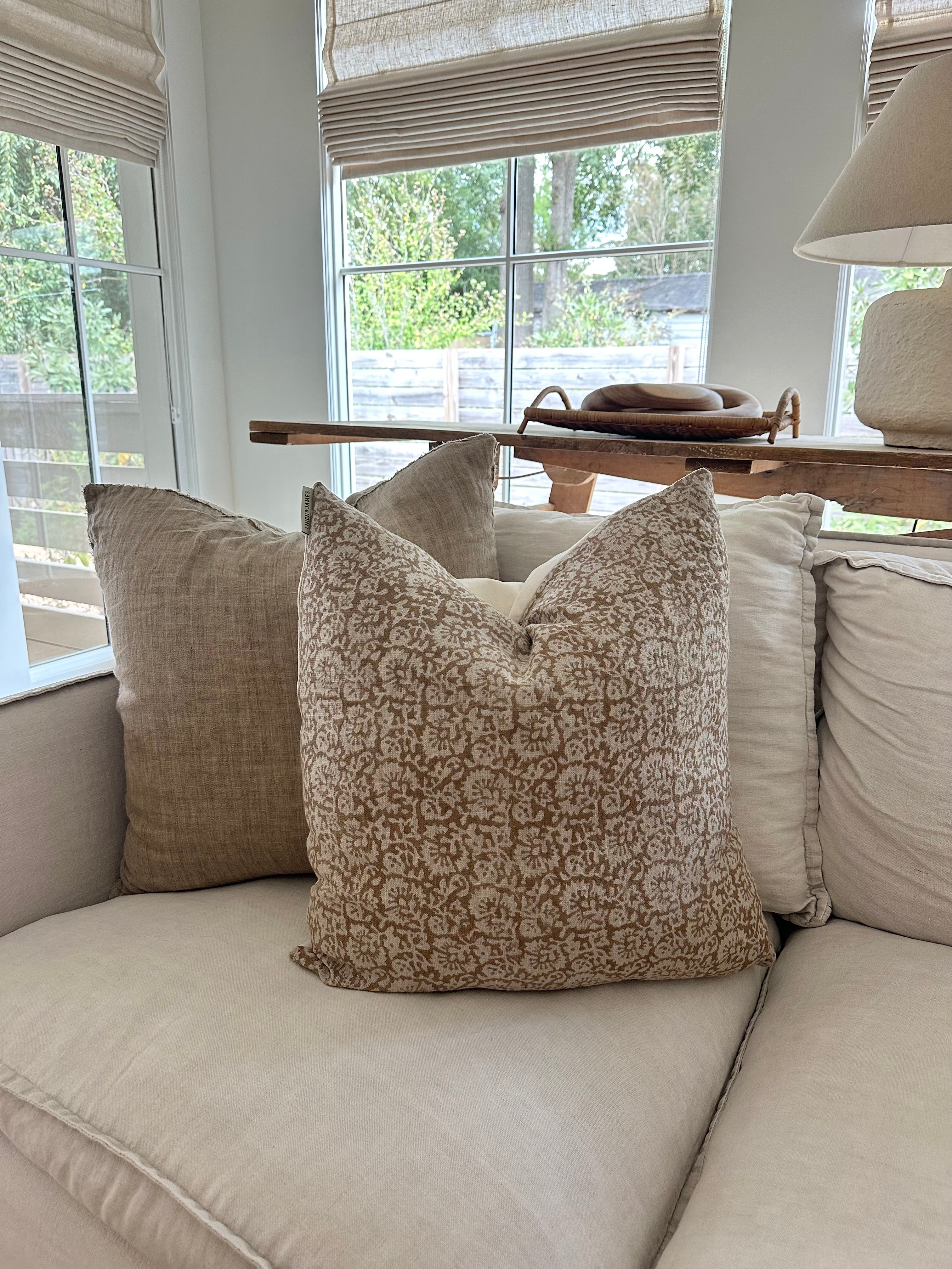 Fall in Love with your space with the timeless charm of this handcrafted block printed linen pillow. Made from premium natural linen, the front showcases an intricate, artisan block print — each design carefully stamped by hand for a unique, one-of-a-kind finish. The pillow is backed with sturdy cotton canvas, adding durability and subtle contrast in texture.