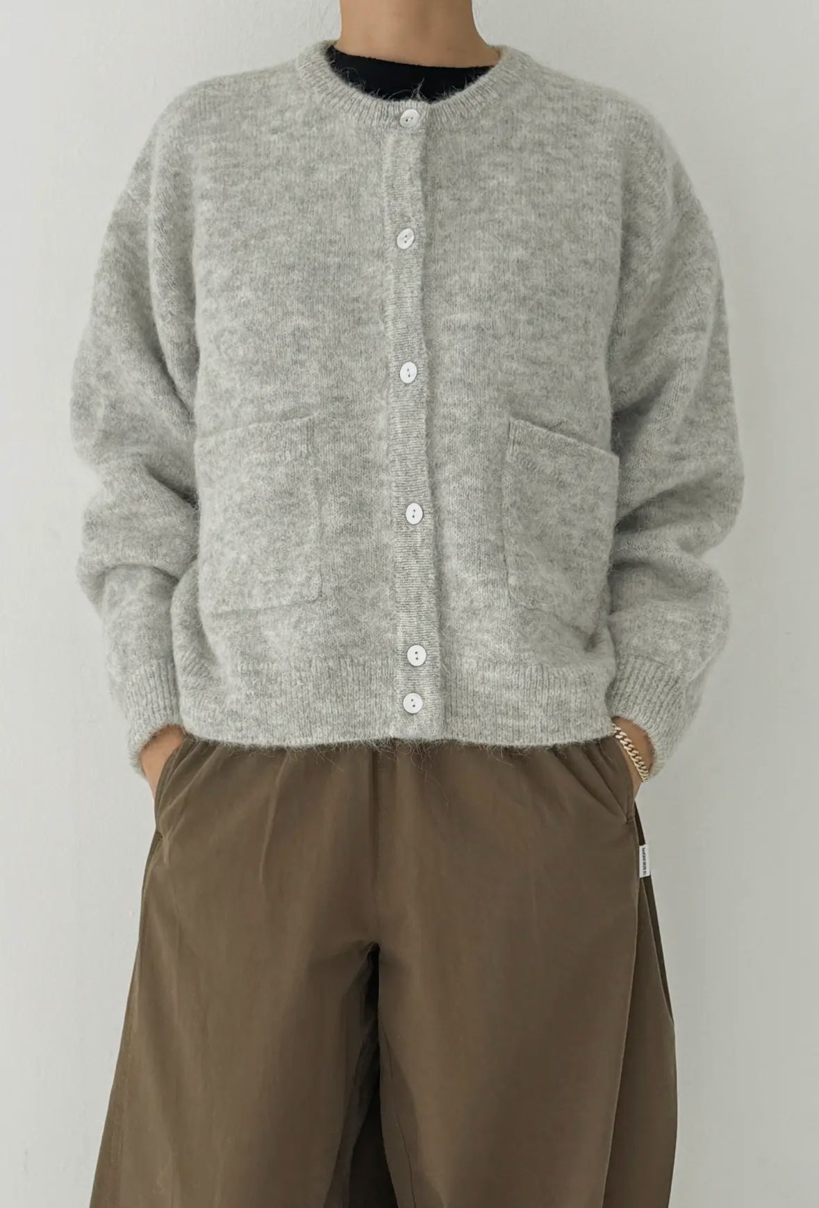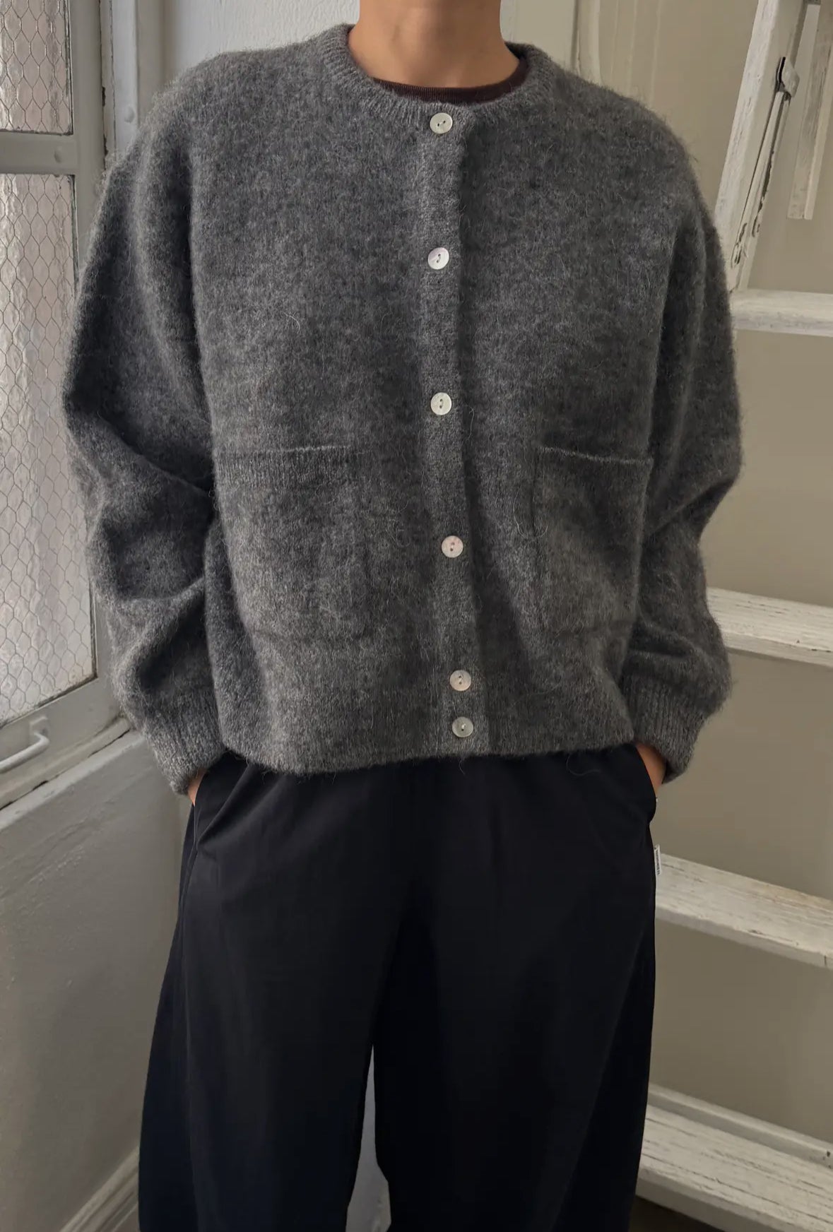 The Amélie Alpaca Cardigan is a fresh take on the classic cardigan, crafted from a soft alpaca-wool blend for a cozy yet refined feel. Designed with natural shell buttons and two front pockets, it combines functionality with style. Its slightly oversized silhouette and balloon sleeves provide a relaxed, comfortable fit while maintaining an elegant appearance. Delicately soft and itch-free, it's the perfect layering piece for everyday wear.